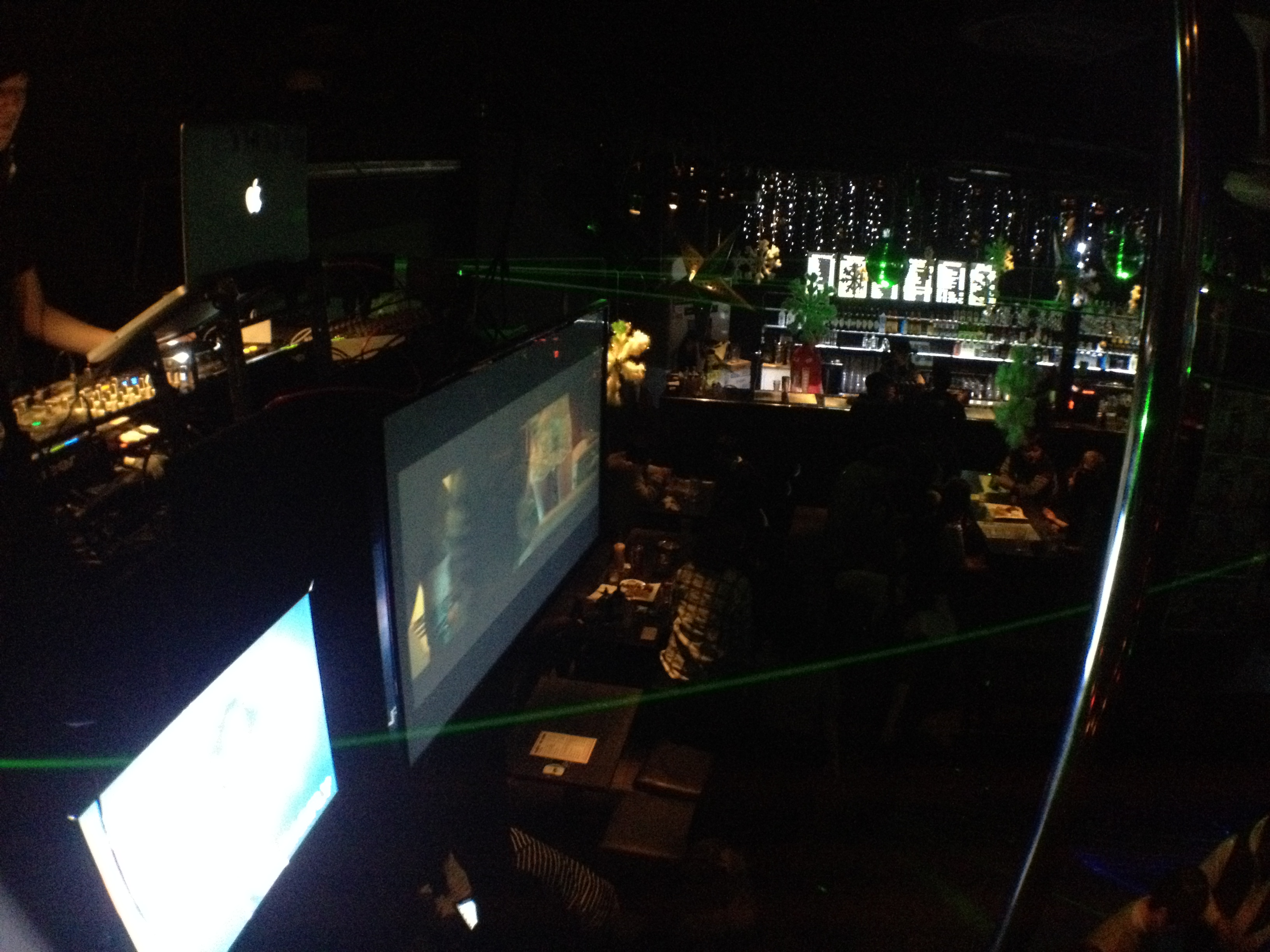 So the DJ Booth, DJM 800 (in desperate need of new faders and a service, same with the CDJs…), CDJ 2000’s, SL4, my laptop, iPad (touchOSC) and dicers. Out putting video to a projector and 4 screens around the bar. Not a bad set up for a mid level club.